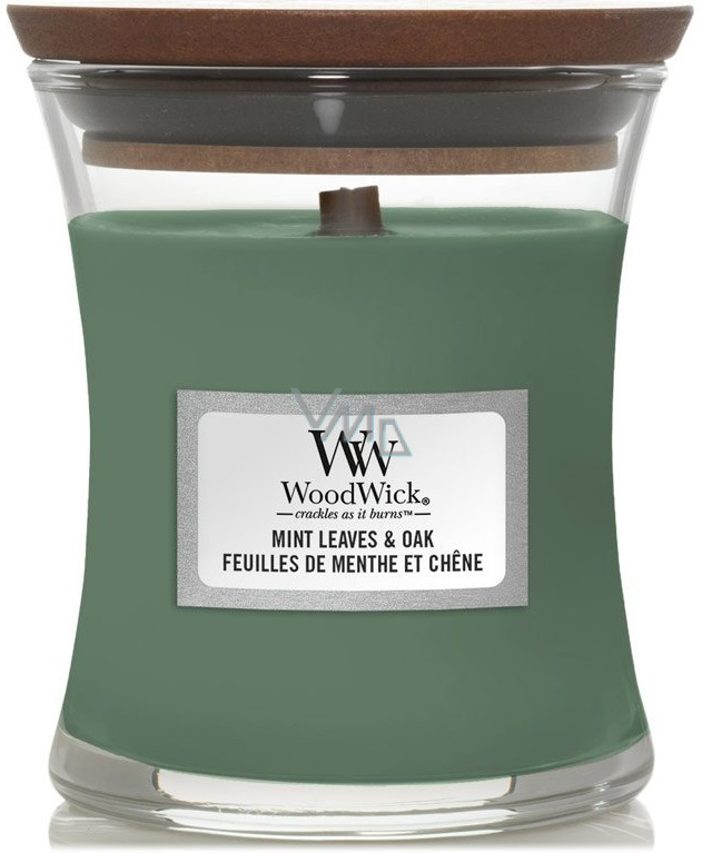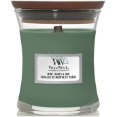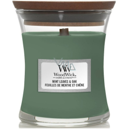 WoodWick Mint Leaves & Oak - Świeca zapachowa z miętowymi liśćmi i dębowym knotem w małym szklanym naczyniu 85 g