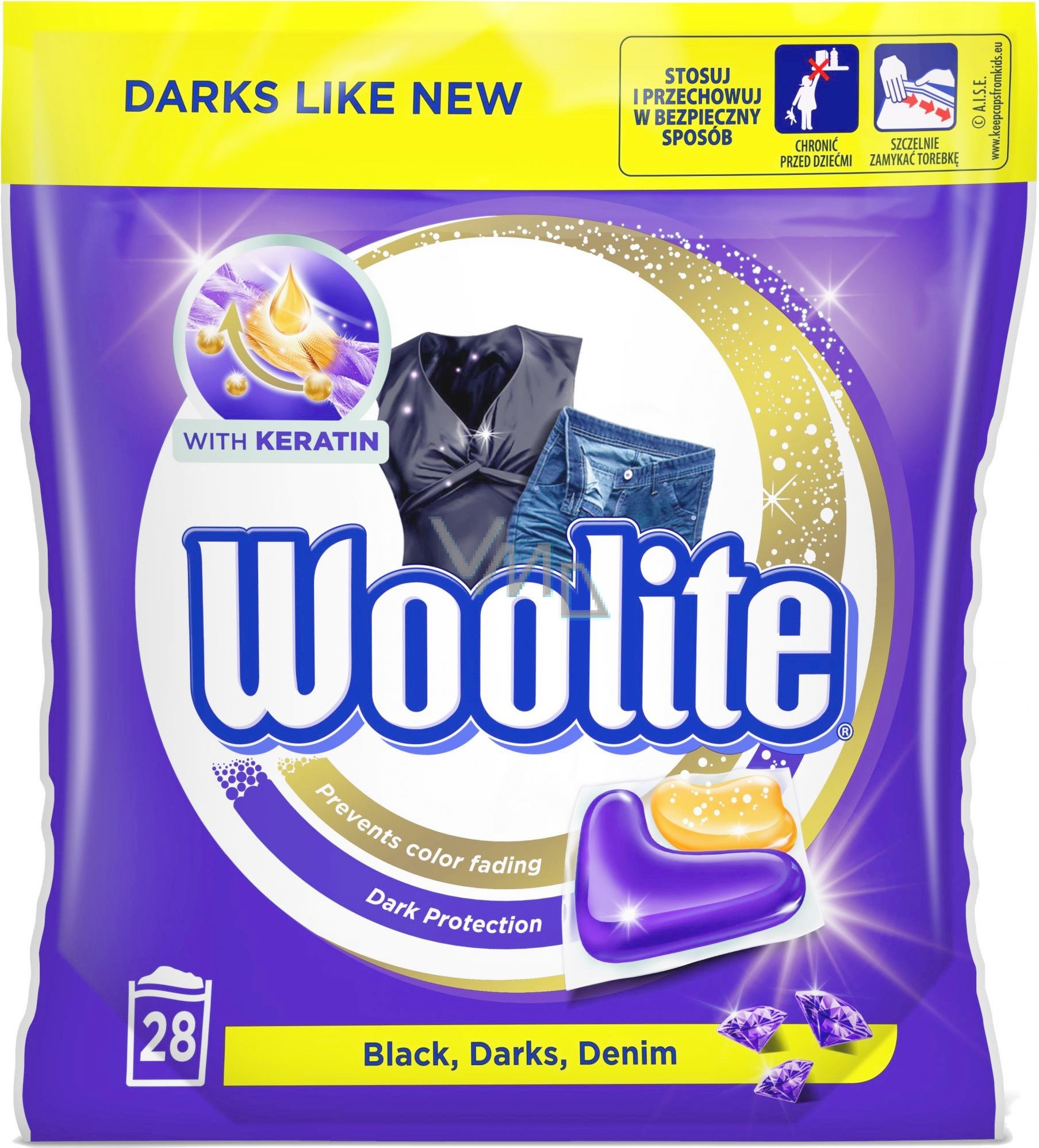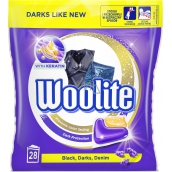 Woolite Dark Black & Denim gelové kapsle s keratinem na tmavé a černé prádlo, odstraní skvrny, ochrana před ztrátou tvaru a zachování intenzity barvy 28 kusů