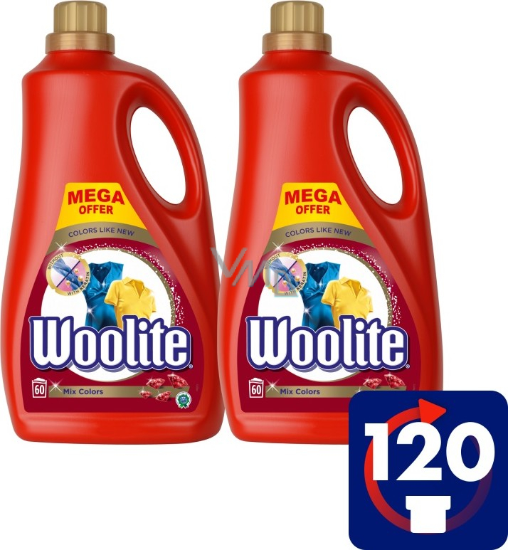 Woolite Mix Colors je speciální tekutý prací prostředek, který účinně pere a chrání barevné oblečení. Díky obsahu keratinu pomáhá chránit textiní vlákna, dodává jim jemnost a látku nemačká.