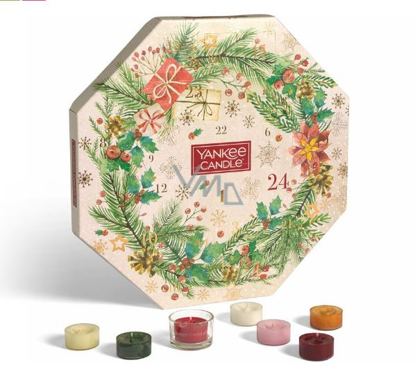 Yankee Candle Adventní kalendář Věnec čajová svíčka 24 kusů + svícen skleněný 1 kus, vánoční dárková sada