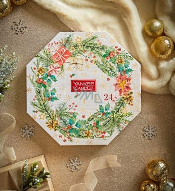 Každé okénko adventního kalendáře ukrývá voňavé překvapení v podobě čajové svíčky, kterých je celkem dvacet čtyři a jednoho skleněného svícnu a logem Yankee Candle. Zapalte si každý den jednu svíčku a vytvořte v domácnosti atmosféru sváteční pohody, kterou si budete moct až do Vánoc. Přední strana adventního kalendáře je zdobena krásnou ilustrací věnce s jehličím, mašlí a zlatými dekoracemi. Díky malého otvoru na zadní straně ho snadno zavěsíte na zeď a proměníte v součást vánoční výzdoby. Adventní kalendář je skvělý dárek pro všechny fanoušky Yankee Candle, kteří si chtějí zpříjemnit advent tím nejlepším možným způsobem, svíčkami Yankee Candle.