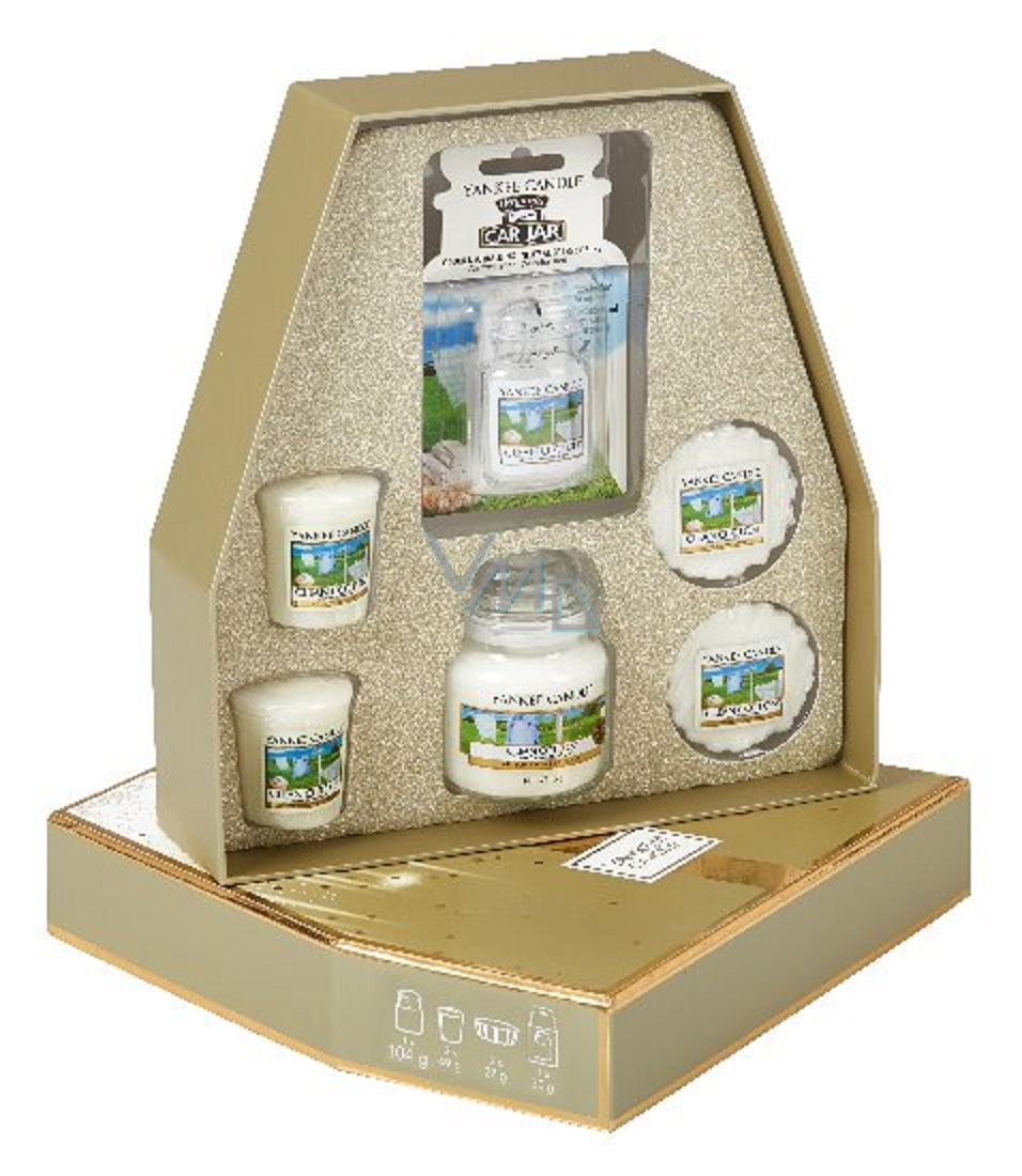 Yankee Candle Clean Cotton - Čistá bavlna vonná svíčka Classic malá sklo 1 x 104 g + vonná svíčka votivní 2 x 49 g + vonný vosk do aromalampy 2 x 22 g gelová vonná visačka do auta 1 x 30 g vánoční dárková sada