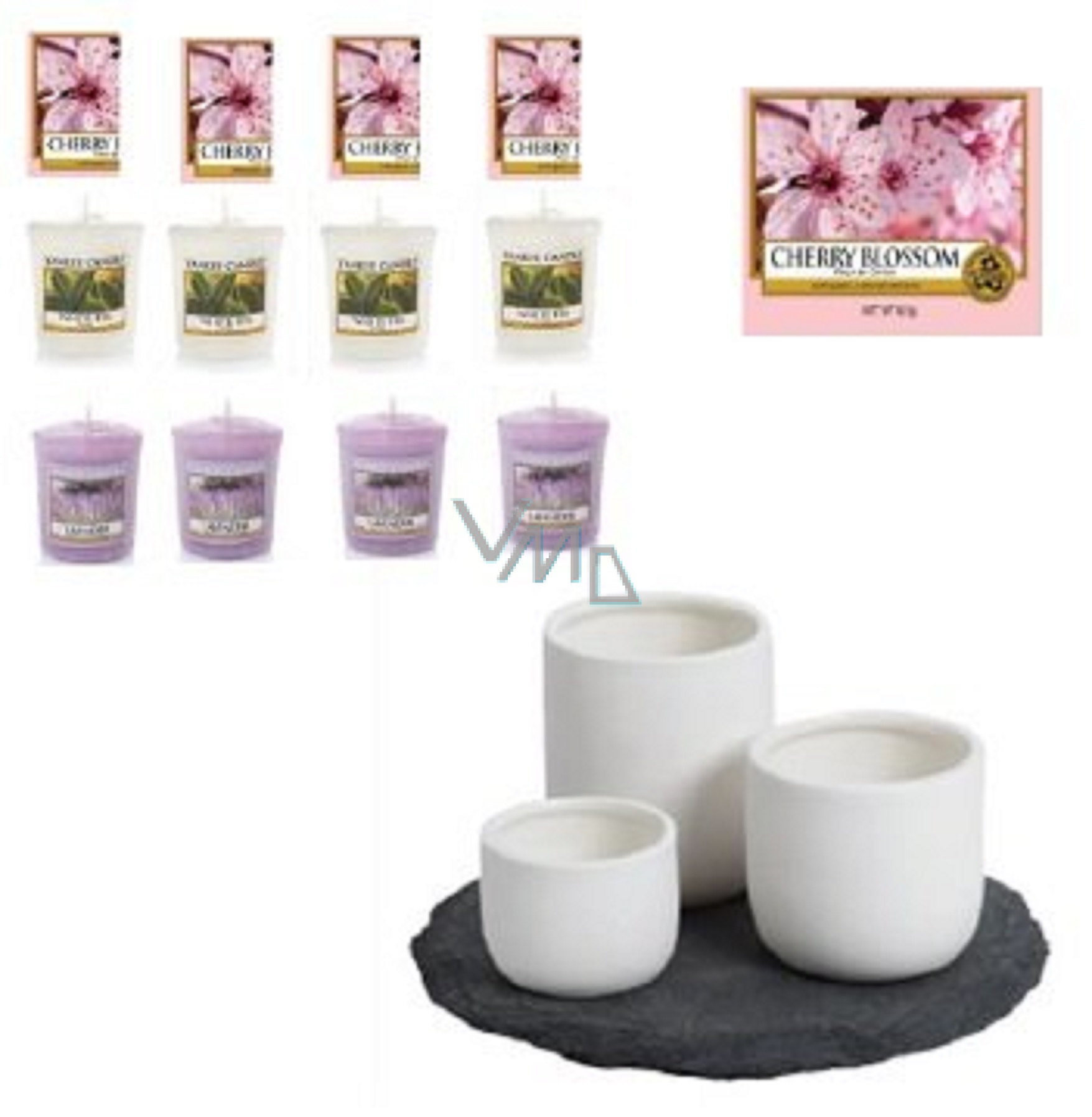Nádherná zenová sada tácku z pravé břidlice a 3 svícnů na votiv dodá vašemu interiéru dotek klidné harmonie mysli. Oblažovat vás budou 3 čisté jarní vůně - levandule, bílého čaje a třešňového kvítku, každá vůně po 4 kusech. V sadě je také jedno balení 12 ks čajových svíček ve vůni Cherry Blossom. Není dárkově baleno.
