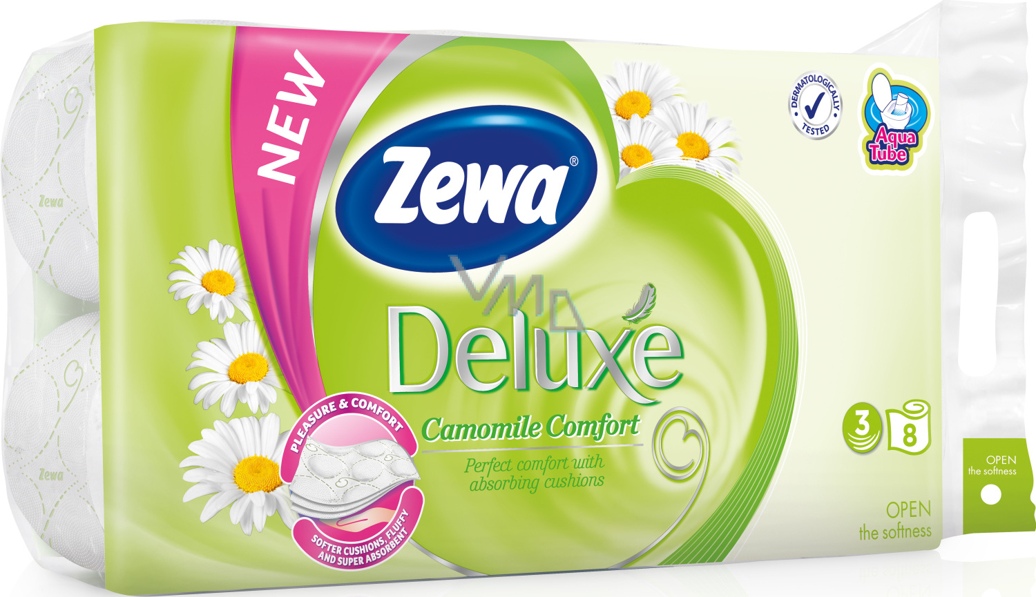 Biały 3-warstwowy papier toaletowy z świeżym zielonym nadrukiem i prawdziwym zapachem rumianku. Dzięki temu stał się prawdziwym faworytem w wielu domach. Logo Zewa potwierdza na tym delikatnym a jednocześnie mocnym papierze sławną jakość marki. Linia Deluxe jest produkowana z recyklingowanego papieru.