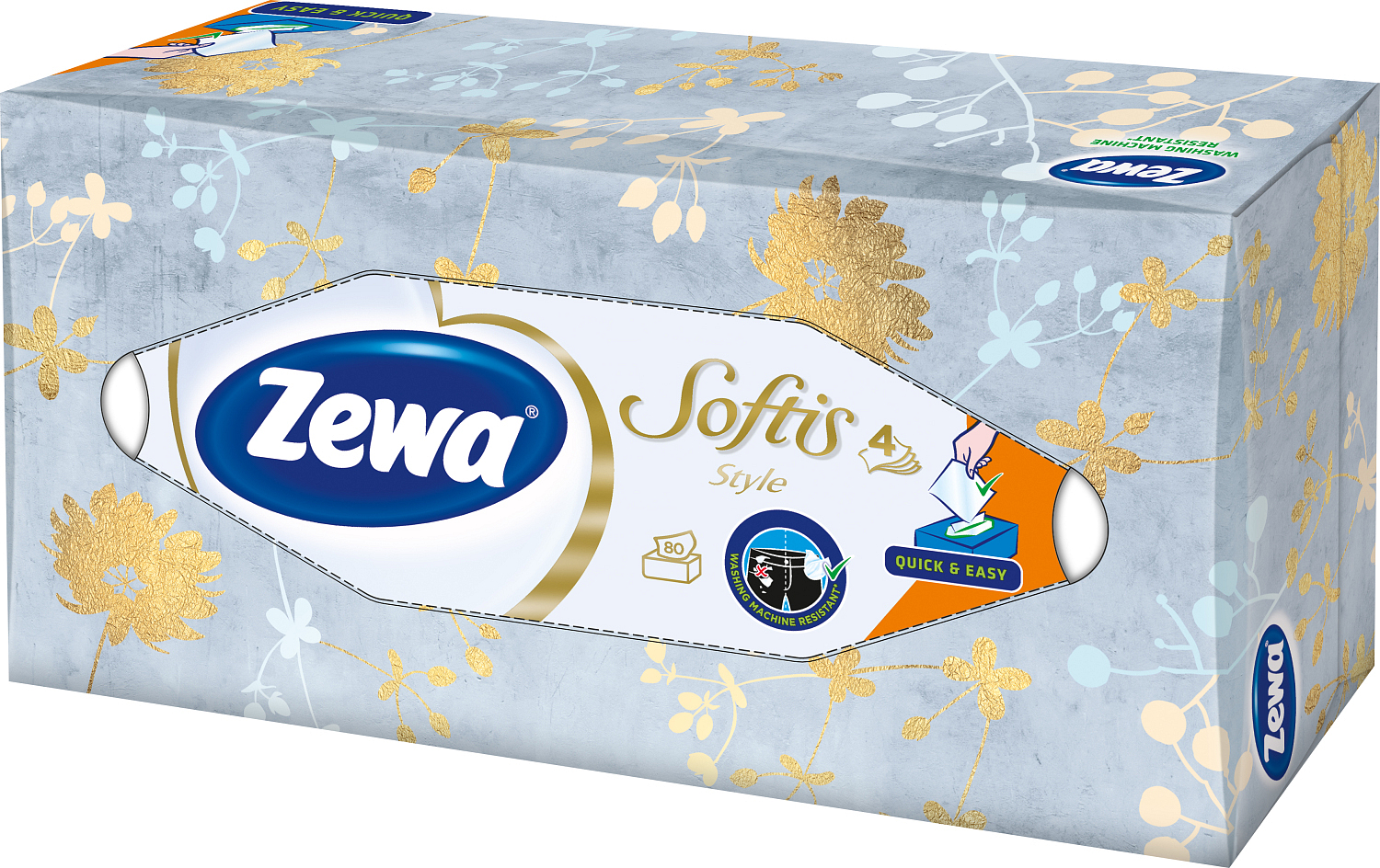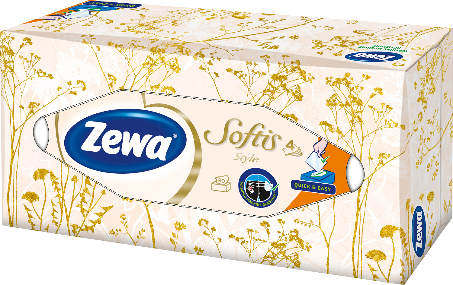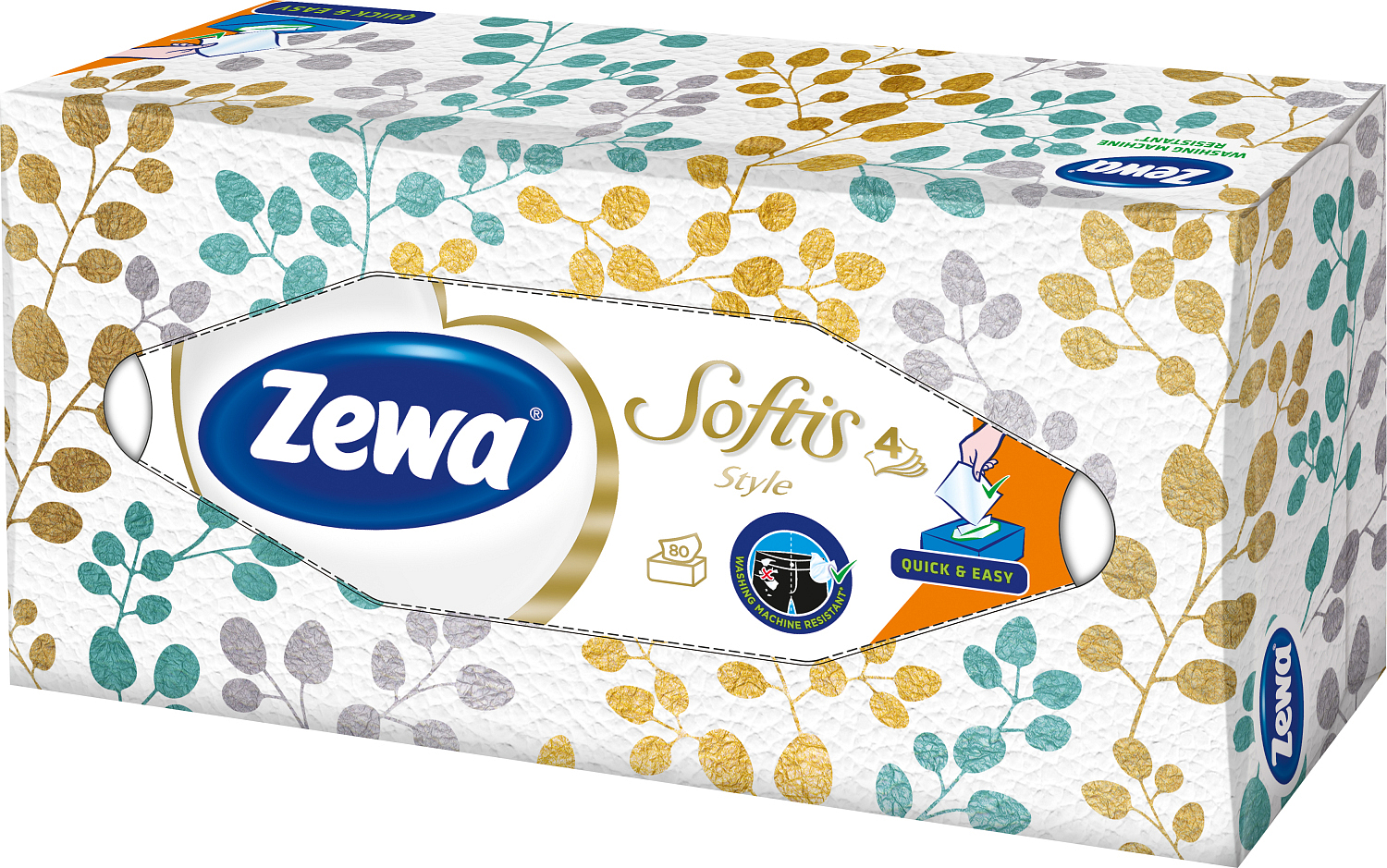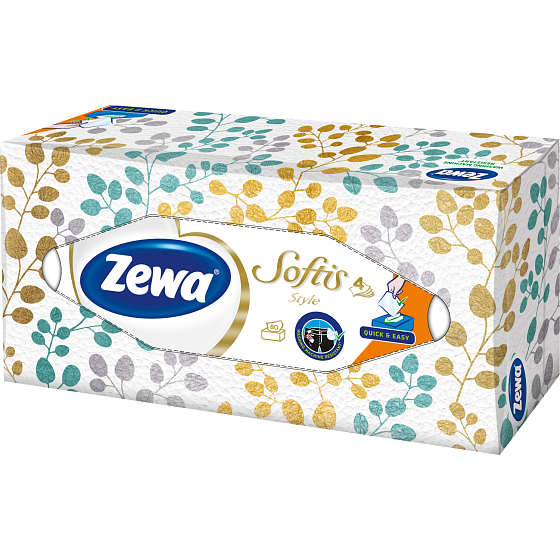Czterowarstwowe chusteczki oferujące ekstra delikatność i wytrzymałość w nowoczesnym praktycznym opakowaniu. Opakowania Zewa Softis Box Design są dostępne w różnych wzorach, które zmieniają się od czasu do czasu. Z nadrukiem logo Zewa, które jest gwarancją naszej dobrze znanej jakości.