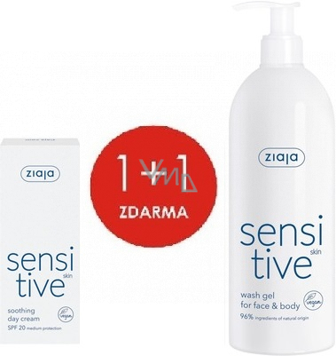 Ziaja Sensitive Skin SPF 20 zklidňující denní krém redukující podráždění 50 ml + Sensitive Skin krémový mycí gel pro citlivou pokožku 400 ml, duopack