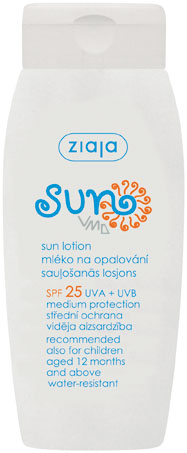 Ziaja Sun Mléko na opalování SPF 25. Voděodolné Mléko pro všechny typy pleti v prvních dnech opalování, zejména vhodné pro světlou a velmi světlou pokožku. Doporučeno pro děti od jednoho roku. Voděodolné Mléko na opalování SPF 25, střední ochrana. Prodlužuje 25 krát dobu bezpečného pobytu na Slunci.