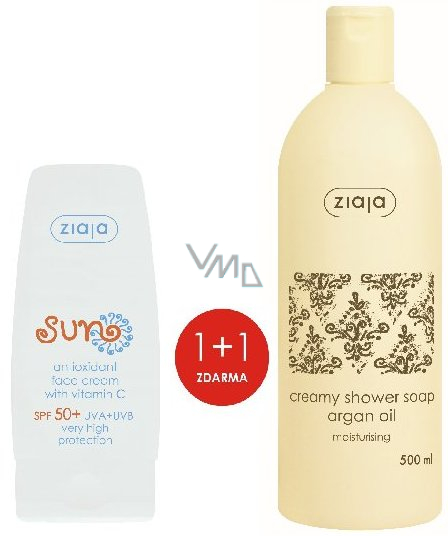 Ziaja Sun SPF 50+ antioxidační krém s vitamínem C 50 ml + Arganový olej krémové sprchové mýdlo 500 ml, duopack